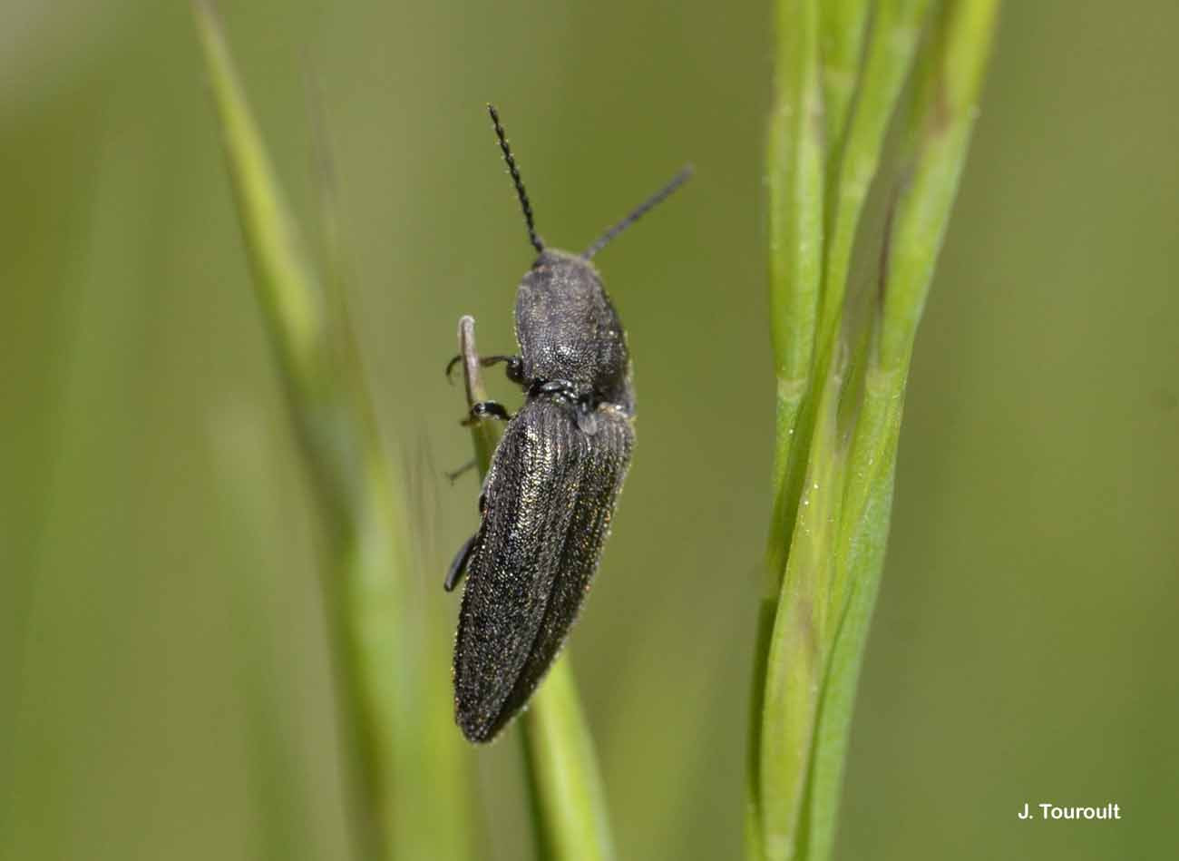 Diagnose : Corps linéaire, allongé, convexe, entièrement d’un noir plombé. La pubescence blanchâtre fine et longue est bien visible. Les antennes longues et fortement dentées à partir du 4ème article dépassent d’un article le bord postérieur du pronotum qui est peu convexe, plus large que long, rectangulaire. La ponctuation du pronotum est grosse et très dense. Les appendices sont noirâtres. La larve est filiforme et cylindrique (de type "ver fil-de-fer"), jaune orangée avec la tête et le dernier segment plus colorés. Identification : Difficile. Confusions possibles : C. aeruginosus a le pronotum aussi long que large, rétréci vers l’avant et très convexe. Périodes d’observation (adultes) : Avril à juillet. Biologie-éthologie : La larve est terricole. Les adultes se rencontrent sur les plantes basses et les buissons. Biogéographie-écologie : Milieux ouverts de toute l’Europe et d’Asie tempérée. Références : Leseigneur L., 1972. Coléoptères Elateridae de la faune de France continentale et de Corse. Bulletin mensuel de la Société Linnéenne de Lyon (supplément au numéro de février 1972) 41 : 1-381.