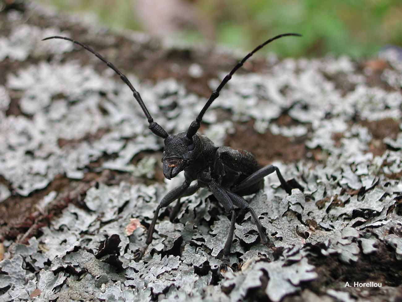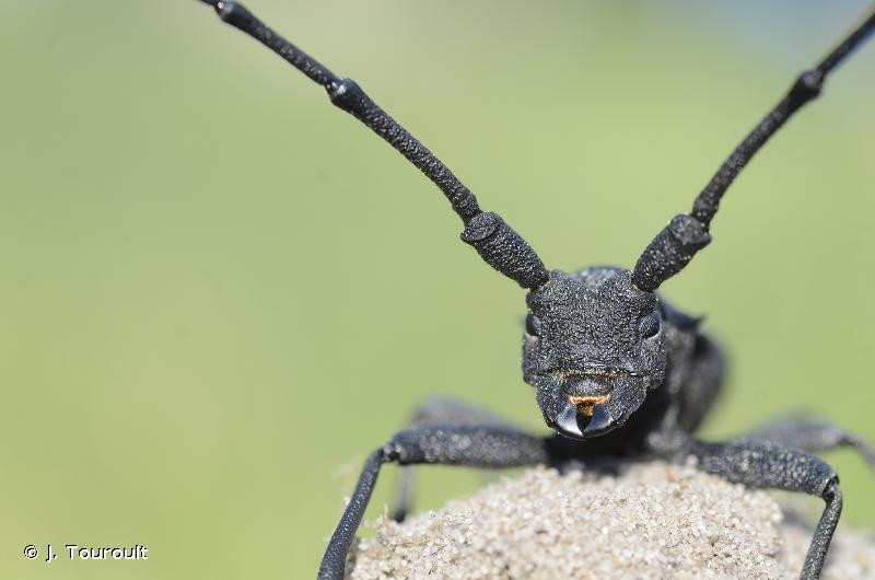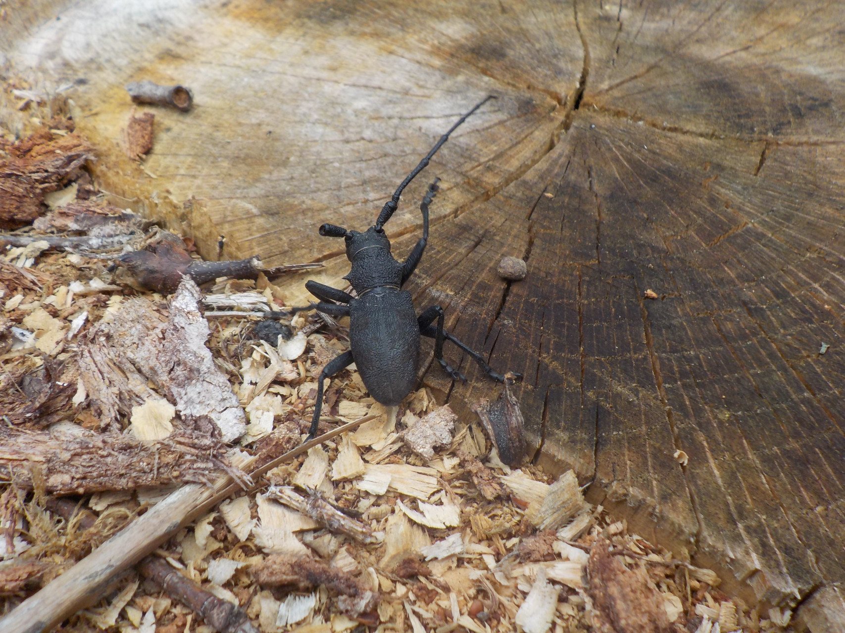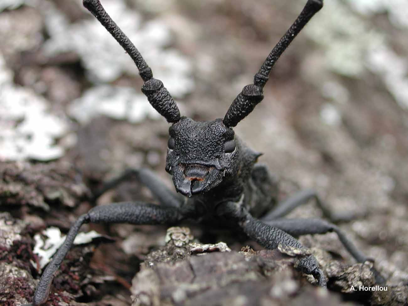 longicorne noir mat, robuste, à forte ponctuation, à cuticule épaisse,