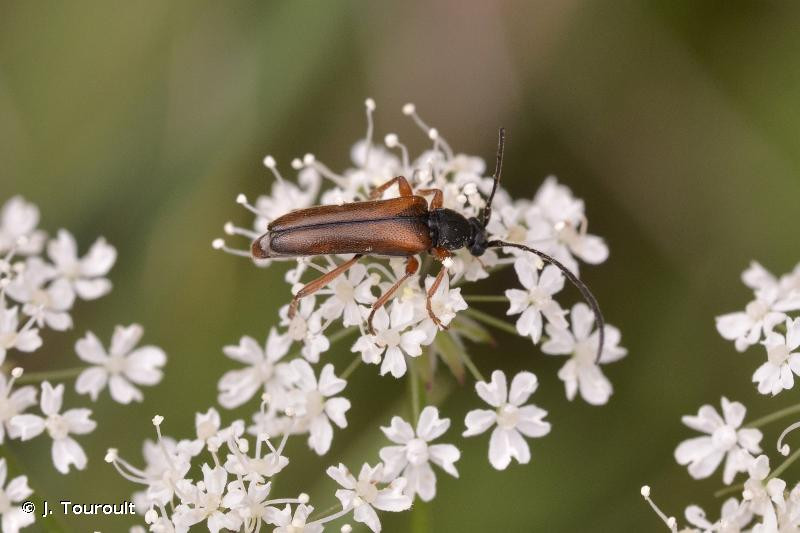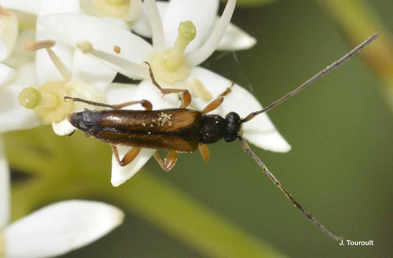 Diagnose : Petit lepture allongé, à stature parallèle; à élytres jaune-fauve avec un liseré sombre le long de la suture; apex élytral arrondi; pattes jaunes avec l'extrémité des fémurs postérieurs et médians assombris chez la femelle. Antennes un peu plus longues que le corps chez le mâle; un peu plus courte chez la femelle.