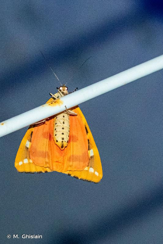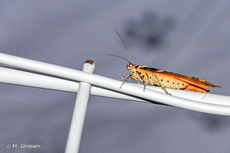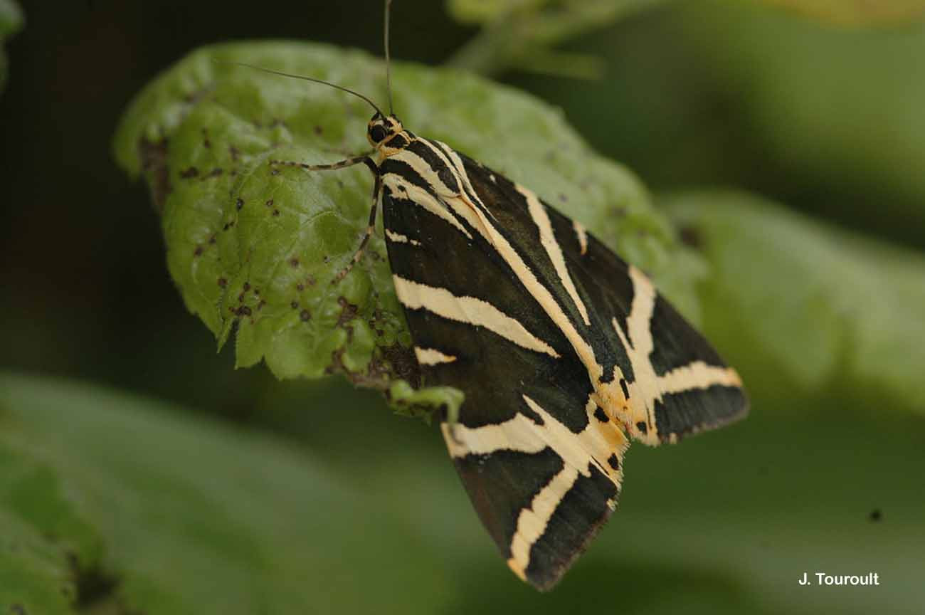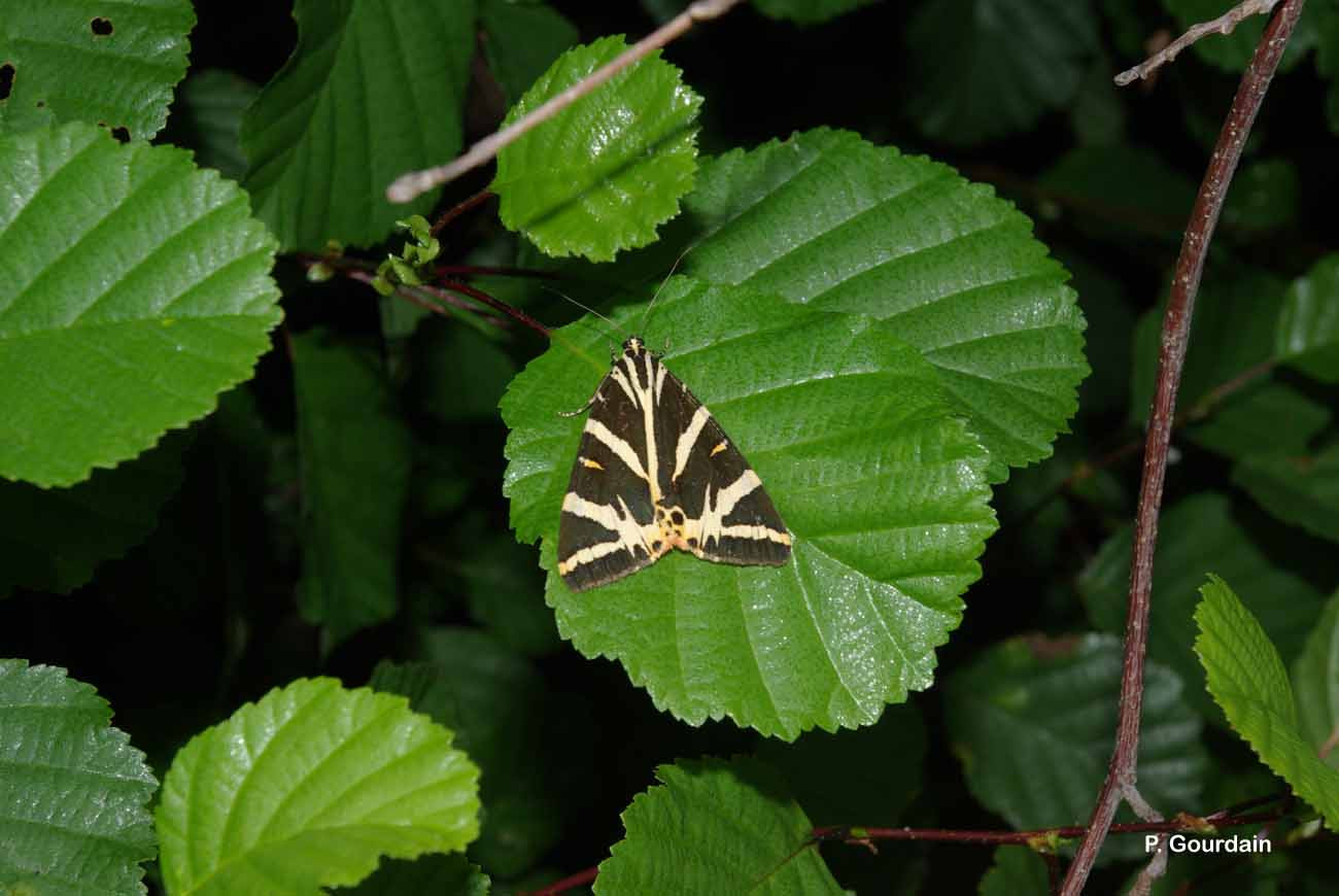 Le dessus des ailes antérieures est vert noir à reflets métalliques avec des bandes jaunes transversales. Le dessus des ailes postérieures, que l'on aperçoit parfois lorsque l'adulte est posé, est généralement rouge vermillon avec des taches noires. Il existe une forme jaune qui se rencontre principalement dans l'ouest de la France.