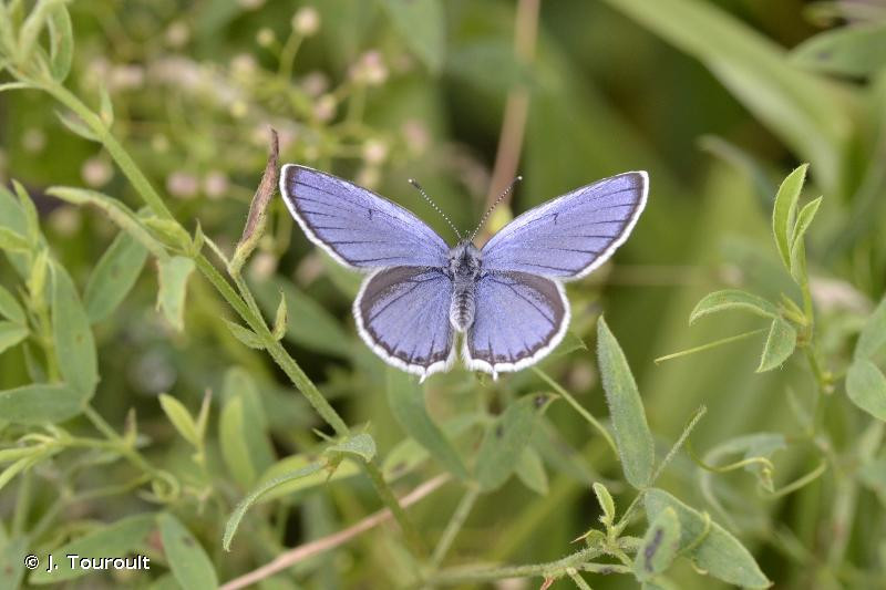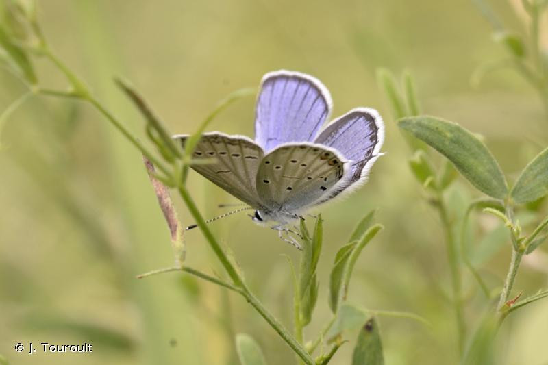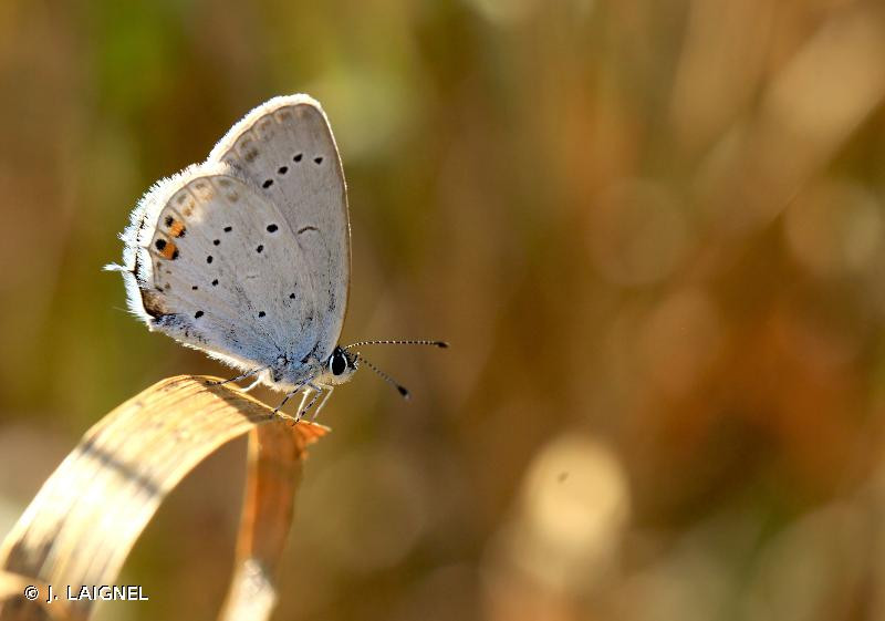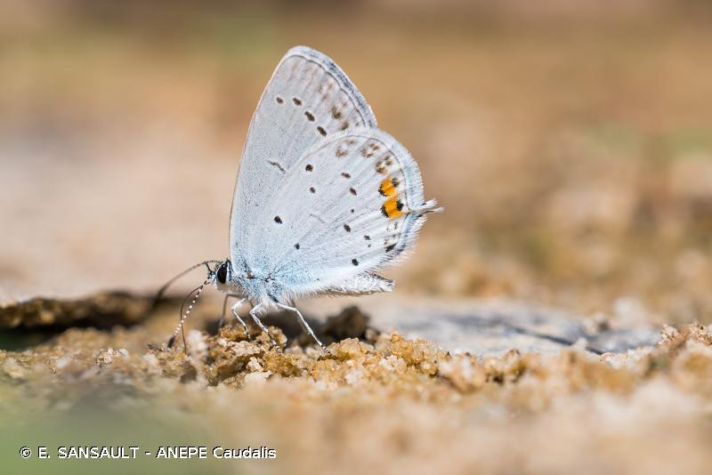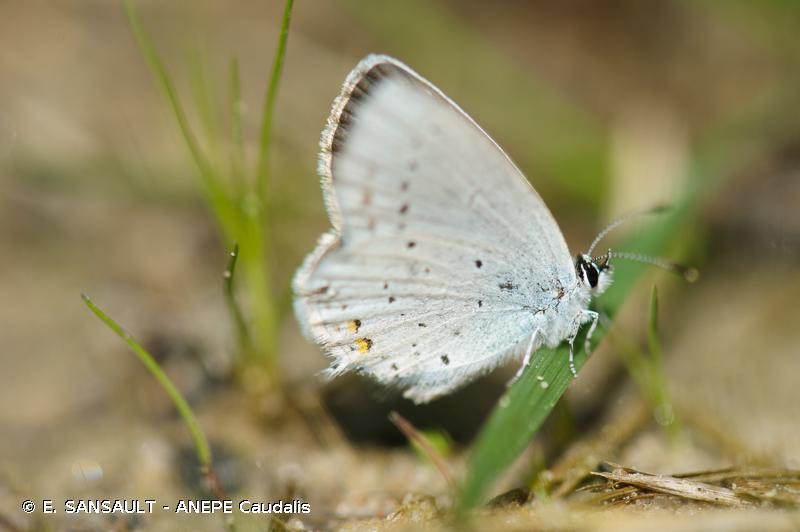 Papillon de petite taille et de couleur bleu foncé sur le dessus du mâle et brun sombre chez la femelle. Le dessous est gris clair avec une série de points noirs cerclés de blanc. Sur le dessous de l’aile postérieure, la présence de une à trois tâches orange et d’une courte queue sont caractéristiques. La chenille est d’abord brun-rouge clair, puis verdâtre et enfin vert au dernier stade.