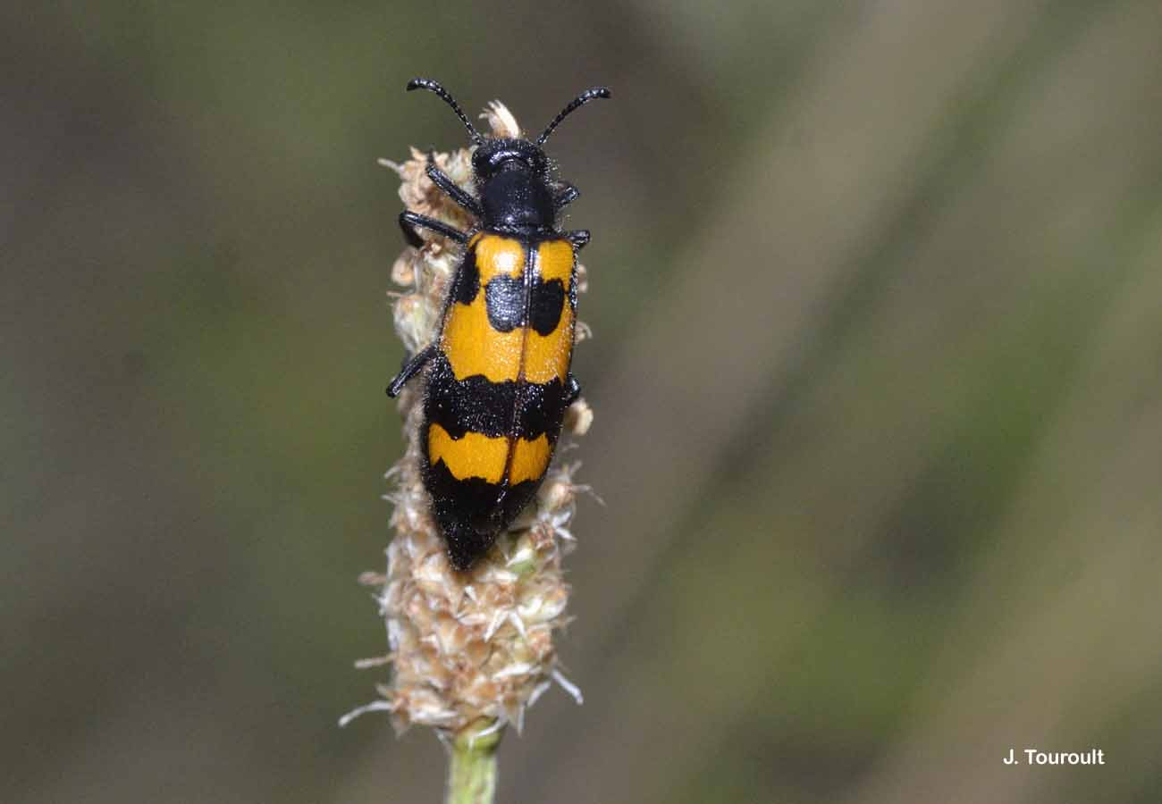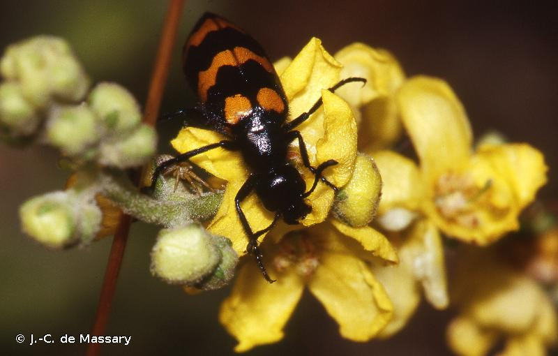 Corps noir avec les élytres noirs avec deux fascies médiane et antéapicale et une tache subhumérale, jaune paille. Avant-corps peu brillant et fortement ponctué, à pubescence noire longue et dressée, le pronotum à côtés parallèles à la base puis fortement rétrécis vers l’avant. Les antennes sont assez longues, atteignant la base du pronotum, à peine épaissies vers l’apex.