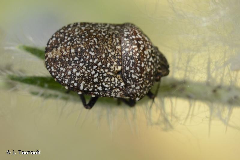 Taille : 9 – 11 mm Diagnose : Punaise allongée et globuleuse, bombée en vue de profil, au scutellum large recouvrant les ailes et l’abdomen en atteignant son extrémité. Son corps est globalement noir avec de nombreux petits points blancs contrastés caractéristiques, régulièrement dispersés. Ses articles antennaires II sont 3 fois plus longs que les articles antennaires III. Détermination : Moyennement difficile. Espèces proches : Psacasta granulata lui ressemble mais c’est une punaise plutôt brune et les petits points blancs sont donc moins contrastés. Cette espèce est plus petite et ses articles antennaires II sont 2 fois plus longs que ses articles III. Période d’observation : De mi-mai à aout, avec un pic en juin. Biologie-éthologie : Cette espèce vit exclusivement sur les Boraginacées, surtout sur les vipérines mais aussi sur la bourrache officinale et plus au nord sur la cynoglosse officinale. Le motif bicolore de son corps, noir avec des petits points blancs lui sert de camouflage, car il est semblable à celui des tiges et feuilles mortes à la base des plants de vipérines. A tel point que quand elle se laisse tomber au sein du collet d’une vipérine, il est quasi impossible de la retrouver d’autant que ces feuilles mortes sont piquantes ! Biogéographie et écologie : Espèce européenne absente d'Afrique du Nord mais qui se rencontre au Proche-Orient et jusqu'en Azerbaïdjan. Absente en Belgique et Grande-Bretagne, on la trouve en Allemagne, en Pologne et en Crimée, et elle ne semble donc pas dépasser 50° de latitude nord. C’est une espèce commune en zone méditerranéenne, devenant beaucoup plus rare en remontant plus au nord. On la trouve dans les garrigues, les friches sèches, les bords rocailleux des chemins, coteaux secs, décharges, anciennes vignes.