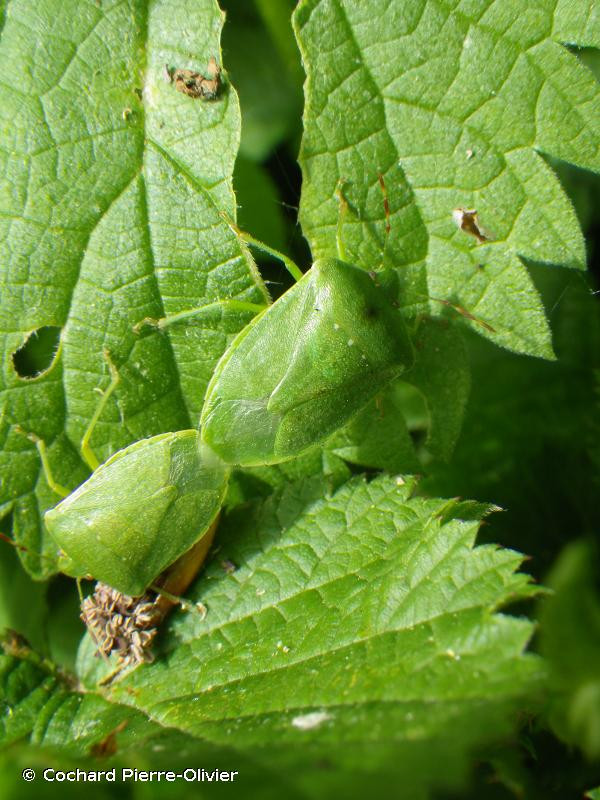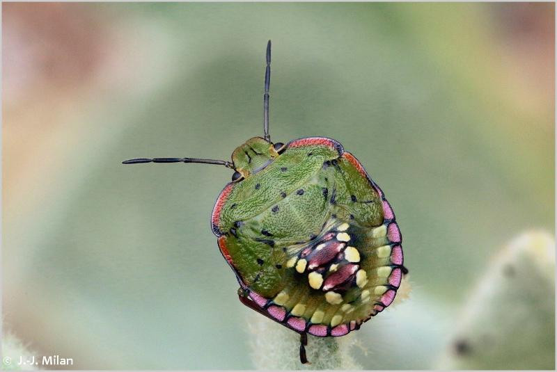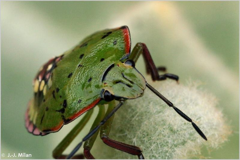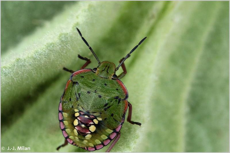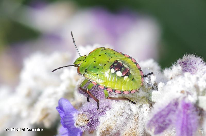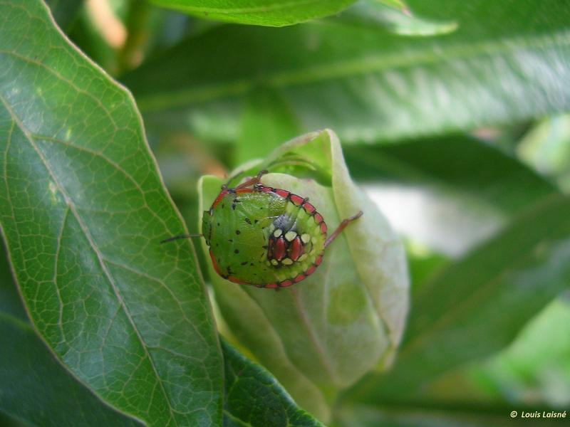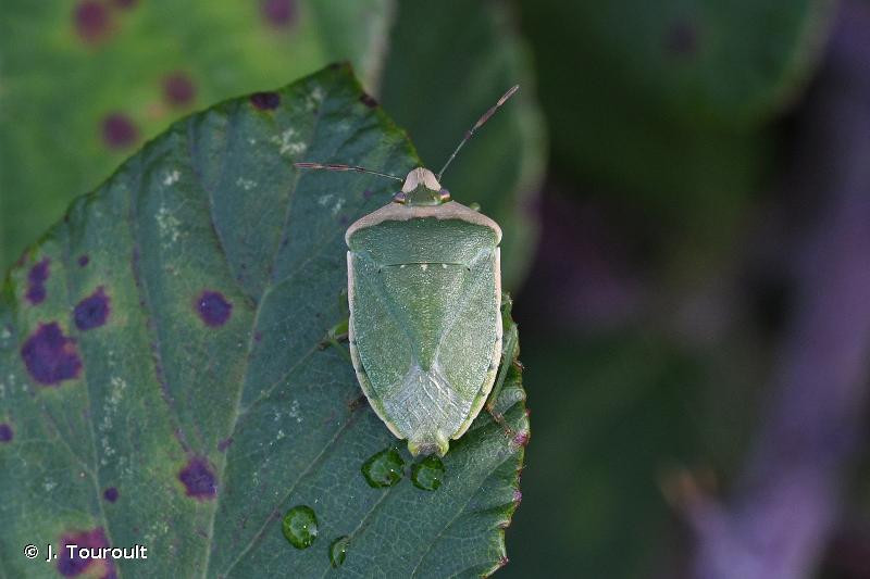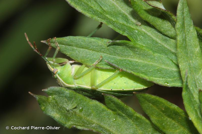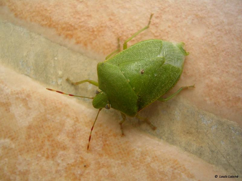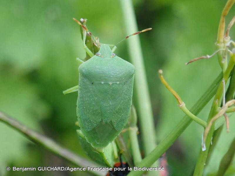Taille : 11,5 – 18 mm Diagnose : Grande punaise entièrement verte. Partie membraneuse des ailes transparente. Elle a 3 petites taches blanches sur le bord antérieur du scutellum et 2 petits points noirs aux angles antéro-latéraux du scutellum. La variété torquata a les parties antérieures du pronotum, de la tête et de l’exocorie couleur ivoire, contrastant avec le reste du corps vert. Détermination : Simple. Espèces proches : Elle est facile à distinguer des autres punaises vertes car c’est la seule qui possède 3 petites taches blanches sur le bord antérieur du scutellum et 2 petits points noirs aux angles antéro-latéraux du scutellum. Période d’observation : Mars à novembre avec un pic principal en septembre. Biologie-éthologie : Espèce très polyphage se nourrissant sur plus de 145 genres de 32 familles de plantes différentes. Elle est connue pour les dégâts qu’elle cause aux plantes maraîchères : tomates, haricots, pois chiches, choux-fleurs, radis. Les adultes rentrent dans les habitations pour hiberner, ils deviennent brunâtres ou rougeâtres en automne pour passer l’hiver, et retrouvent leur couleur verte au printemps après hibernation. Biogéographie et écologie : Seule espèce de Pentatomoidea à distribution cosmopolite, mais limitée aux régions les plus chaudes elle ne dépasse pas encore les 52° de latitude nord. Plutôt méridionale en Europe, elle continue à remonter au nord et à coloniser l’Europe centrale avec le réchauffement climatique. Elle s'est implantée en Grande-Bretagne depuis 2003. Dans les milieux ouverts, bien exposés, riches en plantes herbacées : prairies, cultures, friches, parcs, jardins, bord des chemins, garrigues, dunes, marais. C’est une espèce très commune. Elle est attirée par les lumières, surtout en été.