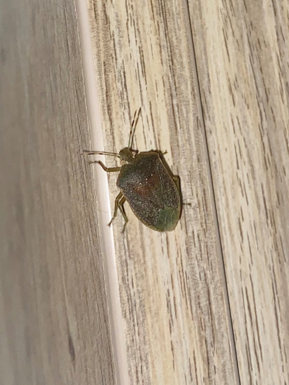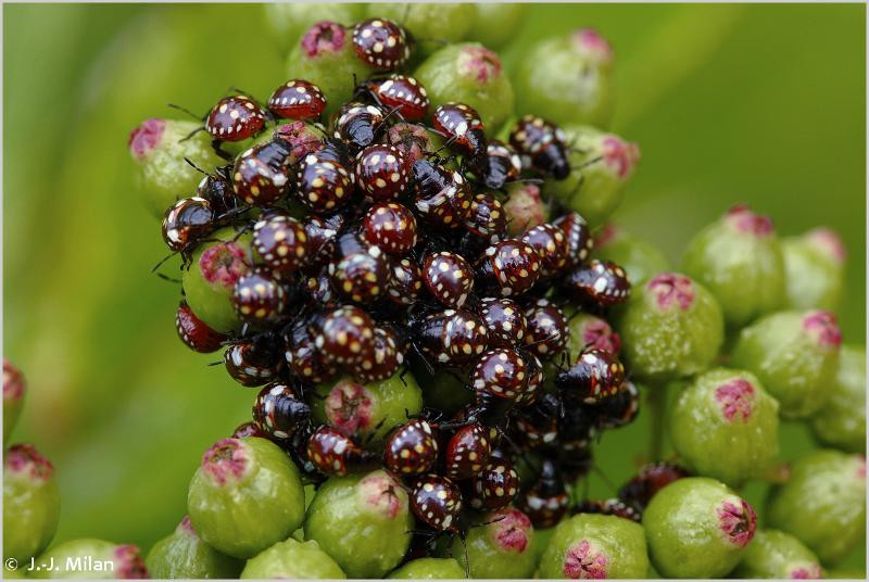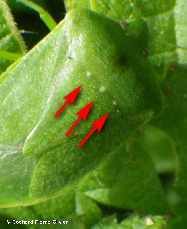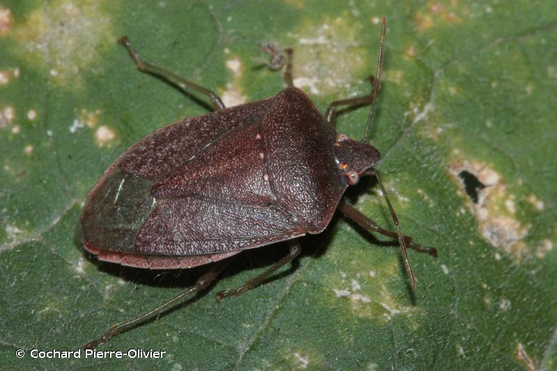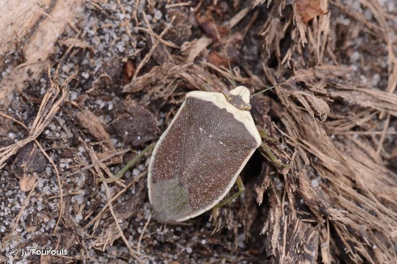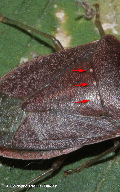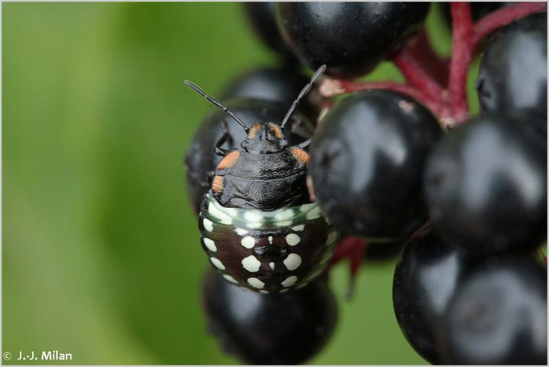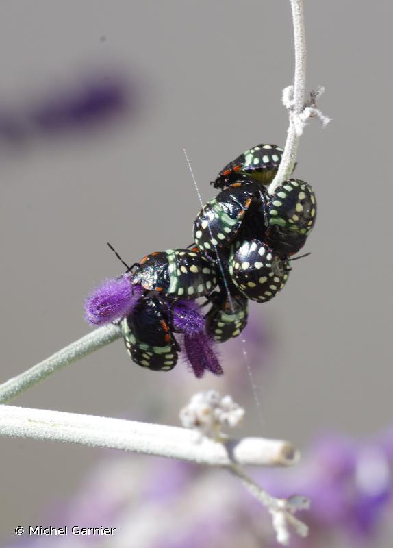 Taille : 11,5 – 18 mm Diagnose : Grande punaise entièrement verte. Partie membraneuse des ailes transparente. Elle a 3 petites taches blanches sur le bord antérieur du scutellum et 2 petits points noirs aux angles antéro-latéraux du scutellum. La variété torquata a les parties antérieures du pronotum, de la tête et de l’exocorie couleur ivoire, contrastant avec le reste du corps vert. Détermination : Simple. Espèces proches : Elle est facile à distinguer des autres punaises vertes car c’est la seule qui possède 3 petites taches blanches sur le bord antérieur du scutellum et 2 petits points noirs aux angles antéro-latéraux du scutellum. Période d’observation : Mars à novembre avec un pic principal en septembre. Biologie-éthologie : Espèce très polyphage se nourrissant sur plus de 145 genres de 32 familles de plantes différentes. Elle est connue pour les dégâts qu’elle cause aux plantes maraîchères : tomates, haricots, pois chiches, choux-fleurs, radis. Les adultes rentrent dans les habitations pour hiberner, ils deviennent brunâtres ou rougeâtres en automne pour passer l’hiver, et retrouvent leur couleur verte au printemps après hibernation. Biogéographie et écologie : Seule espèce de Pentatomoidea à distribution cosmopolite, mais limitée aux régions les plus chaudes elle ne dépasse pas encore les 52° de latitude nord. Plutôt méridionale en Europe, elle continue à remonter au nord et à coloniser l’Europe centrale avec le réchauffement climatique. Elle s'est implantée en Grande-Bretagne depuis 2003. Dans les milieux ouverts, bien exposés, riches en plantes herbacées : prairies, cultures, friches, parcs, jardins, bord des chemins, garrigues, dunes, marais. C’est une espèce très commune. Elle est attirée par les lumières, surtout en été.