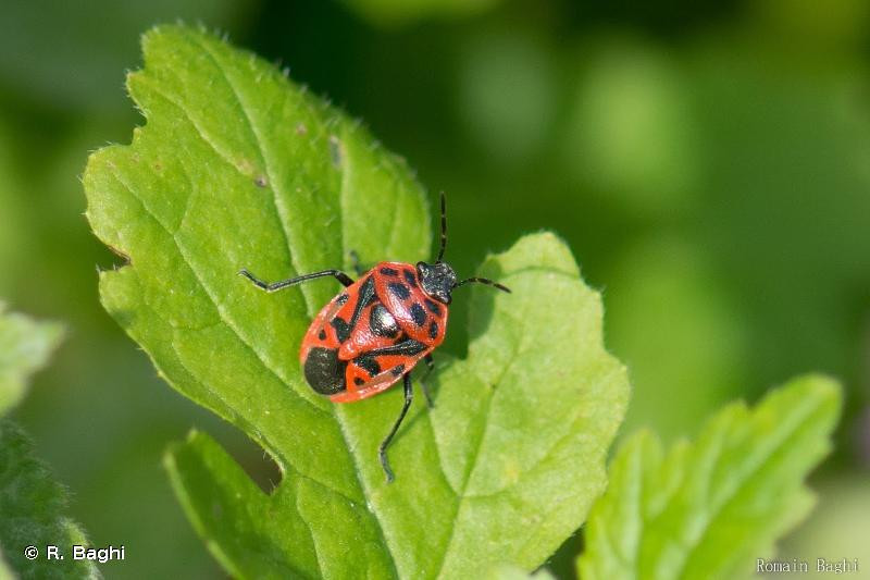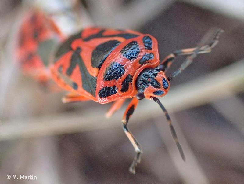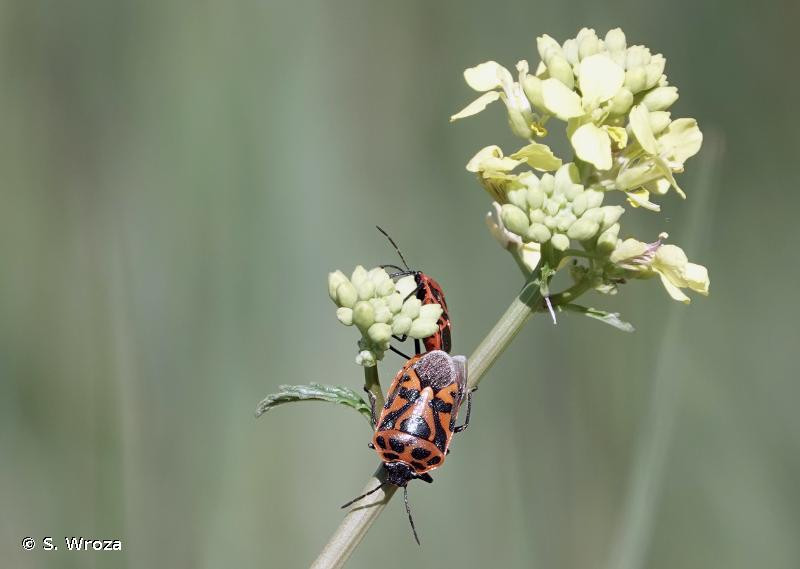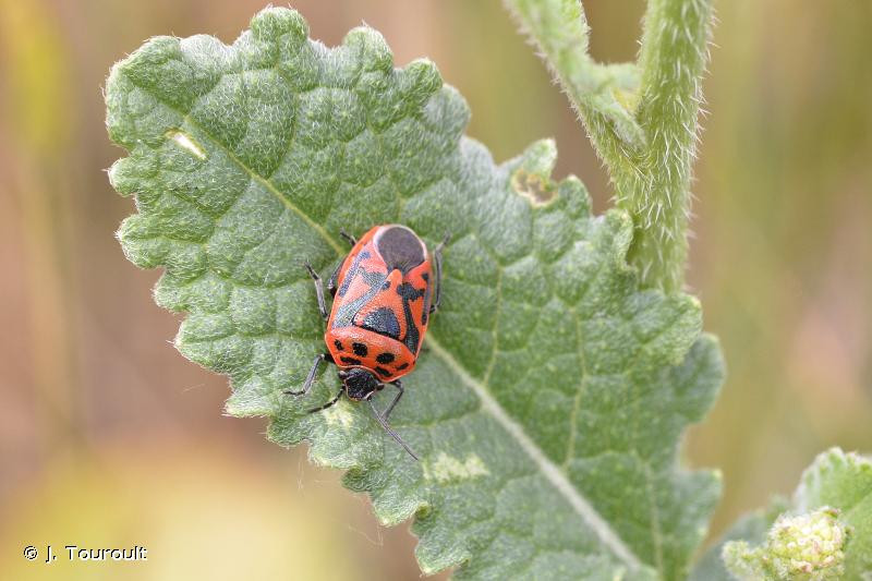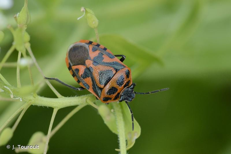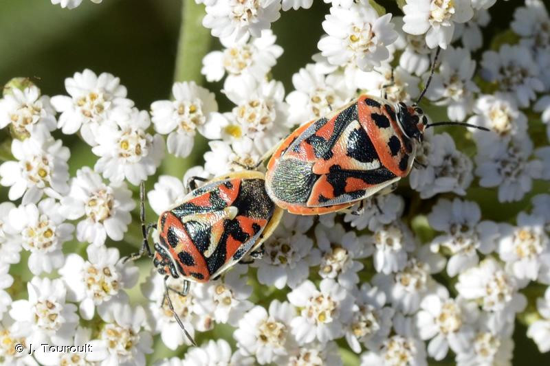 Taille : 7 – 9,2 mm Diagnose : Punaise de coloration générale noire à reflets métalliques, bariolée de taches claires rouges, orange ou blanches. Corie (partie sclérifiée de l’aile antérieure) dont la partie centrale (mésocorie) porte au moins 2 grandes taches claires, et dont la partie externe latérale (exocorie) porte une tache noire en son milieu, et souvent une zone sombre délavée en arrière de cette tache. Scutellum avec une tache claire principale en forme de Y. Détermination : Moyennement difficile. Espèces proches : Elle ressemble à Eurydema dominulus, mais celle-ci n’a pas de tache médiane noire sur l’exocorie. Elle ressemble aussi à Eurydema ventralis plus large et massive et dont le connexivum (bord de l’abdomen) montre 4 taches quadrangulaires noires visibles alors qu’on en voit que 3 chez E. ornata. Période d’observation : Mars à novembre, avec le plus d’observations de mai à août et un pic en juin. Biologie-éthologie : Elle vit sur de nombreuses espèces de crucifères et peut causer des dégâts sur celles qui sont cultivées (choux, colza, navet). Elle se nourrit aussi sur d’autres plantes dont des Asteracées, des légumineuses ou des graminées. Biogéographie et écologie : Espèce Paléarctique. Accidentelle en Grande-Bretagne, elle ne dépasse pas 60° de latitude nord en Suède. Répandue depuis les Canaries, en Afrique du Nord, et à l'est en Ethiopie, Pakistan, Chine et Sibérie jusqu'au Pacifique. Elle vit jusqu’à 1 700 m d’altitude dans les prairies fleuries, pelouses rases, landes et lisières forestières, garrigues, dunes, bords de chemins, jardins, friches, cultures de crucifères. Elle est commune dans la partie méridionale de son aire, plus rare au nord. On la trouve souvent en mélange avec E. oleracea et E. ventralis.