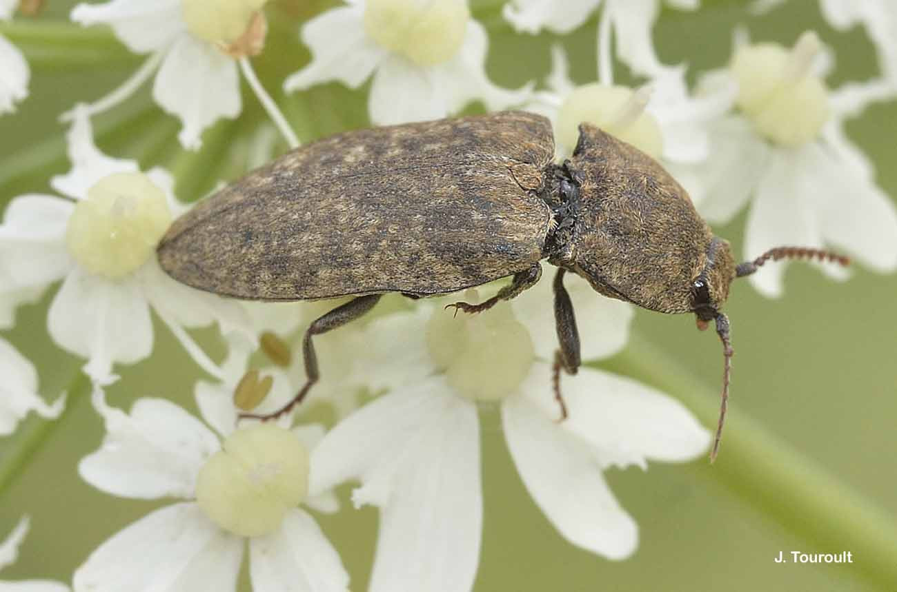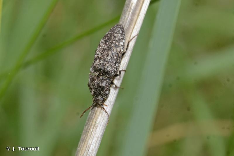 Diagnose : Corps massif, convexe, noir couvert de poils squamiformes variant du blanc au fauve. Les antennes sont courtes et épaisses, n’atteignant pas le bord postérieur du pronotum. Le pronotum est transverse, à angles postérieurs obtus mais fortement saillants vers l’extérieur. Les pattes sont brun foncé avec les tarses rougeâtres. La larve est filiforme et cylindrique (de type "ver fil-de-fer"), jaune orangée avec la tête et le dernier segment plus colorés. Identification : Assez difficile. Confusions possibles : Les espèces du genre Lacon qui ont une stature comparable, ont une vestiture différente et sont moins répandues. Périodes d’observation (adultes) : Avril à juillet. Biologie-éthologie : La larve est terricole. L’adulte se trouve sur les plantes basses et vole en fin de journée. Biogéographie-écologie : Milieux ouverts et boisements clairs de toute l’Europe, en plaine et jusqu’à la zone alpine. Références : Leseigneur L., 1972. Coléoptères Elateridae de la faune de France continentale et de Corse. Bulletin mensuel de la Société Linnéenne de Lyon (supplément au numéro de février 1972) 41 : 1-381.