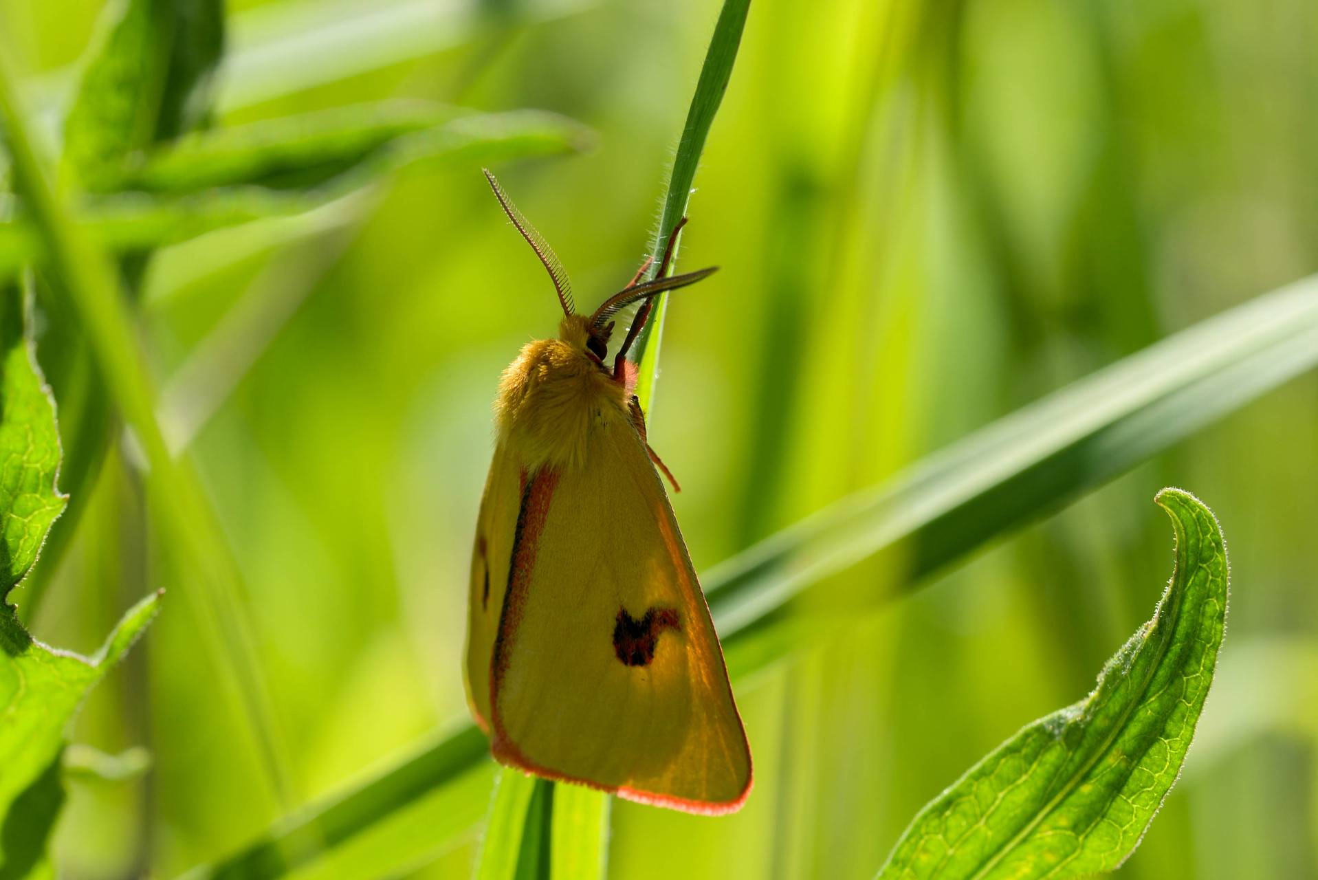 Cette espèce présente un dimorphisme sexuel de taille, mais aussi alaire. Le mâle a le dessus de l'aile antérieure jaune concolore avec le reste du corps, avec une tache discale rose mêlée par endroit de brun gris ; les franges, le bord interne et la côte de l'aile à proximité de l'apex sont roses. Le recto des ailes postérieures est blanc jaunâtre avec une large bande marginale et une tache réniforme brun gris. La femelle a le dessus de l'aile antérieure ocre, avec une tache discale, des nervures et la côte marquées de brun rose. Le fond du dessus des ailes postérieures est concolore à l'aile antérieure avec la présence d'une suffusion brun noirâtre qui est variable en taille d'un individu à l'autre. Contrairement au mâle, on notera que l'abdomen de la femelle est ponctué sur chaque segment par des taches longitudinales brun noirâtre.