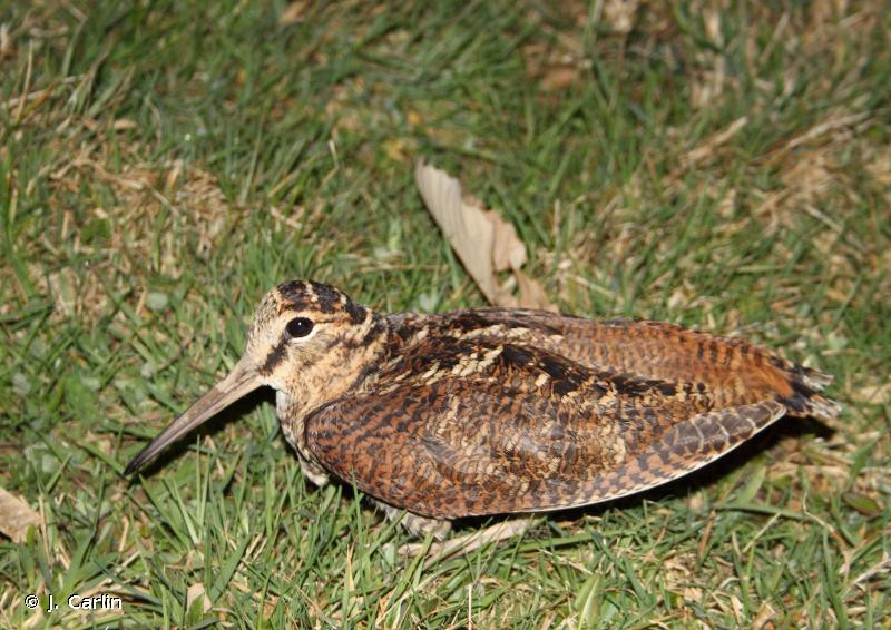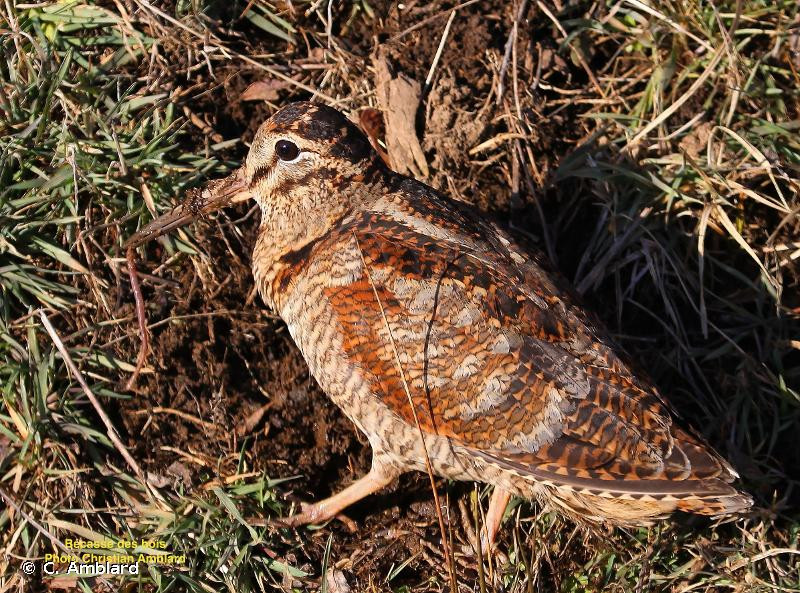 La bécasse des bois est un limicole trapu, court sur pattes, au bec long, de la taille d’une Perdrix grise. Le plumage dorsal est dominé par les teintes noires, brunes et grises. La face ventrale et les flancs présentent une dominante gris-beige avec des rayures transversales. Trois ou quatre barres transversales noires ornent l’arrière du crâne. Un bandeau noir relie la commissure du bec à l’œil. L’ensemble confère à l’oiseau une excellente homochromie avec l’habitat. Les yeux de la bécasse sont hauts placés sur le crâne et permettent une vision circulaire sans mouvement de la tête.