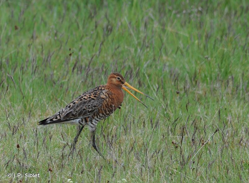 La Barge à queue noire est un limicole d’assez grande taille. En plumage nuptial, le cou et les joues sont orangés, la poitrine, de même teinte, est barrée horizontalement de stries foncées. Le ventre et les sous-caudales sont blancs. Le bec est très long, très légèrement incurvé vers le haut. En plumage inter nuptial, le plumage est à dominante grise. La queue est blanche à la base, contrastant avec le noir de sa partie terminale, cela quelle que soit la saison.