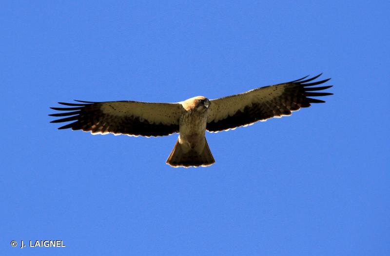 L’Aigle botté, de la taille d’une buse variable, est le plus petit des aigles. Il présente une grosse tête proéminente, six rémiges primaires fortement digitées, et des tarses emplumés, points communs aux autres aigles. La queue est sensiblement aussi longue que la largeur de l’aile, droite avec l’extrémité carrée. La forme claire a le dessous du corps blanc, légèrement strié à la poitrine et à la tête contrastant avec les rémiges noires à l’exception de trois primaires internes qui forment une fenêtre plus claire. La forme sombre présente une face inférieure brun foncé à brun roux. Comme dans la forme pâle, trois rémiges primaires internes dessinent une zone plus claire.