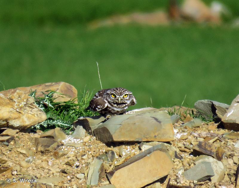 La Chouette chevêche possède un plumage brun terre sur le dessus et le dessous est blanc jaunâtre avec de larges rayures brunes, assez serrées sur la poitrine. Les pattes sont couvertes de plumes blanchâtres et les doigts parsemés de plumes filiformes. La calotte est tachetée de multiples petits points blancs et les épaules sont constellées de grosses tâches blanches.