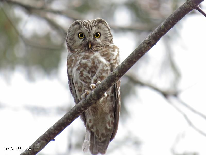 La Chouette de Tengmalm possède un disque facial pâle et bien dessiné, bordé de brun-noir. De part et d’autres du bec, un trait noir orne le dessous des yeux jaune citron. Le dessus brun foncé est constellé de pois blancs et le dessous est pâle et couvert de tâches et rayures diffuses brun-gris. Les pieds sont revêtus jusqu’aux ongles d’un plumage d’aspect laineux. Le vol est rectiligne.