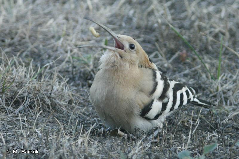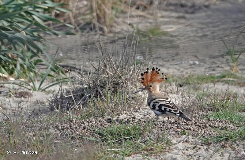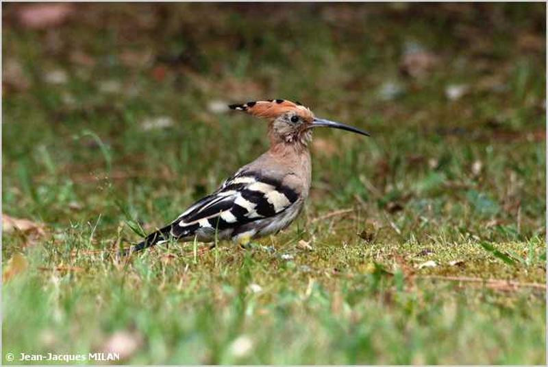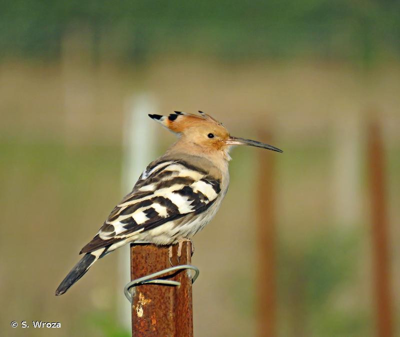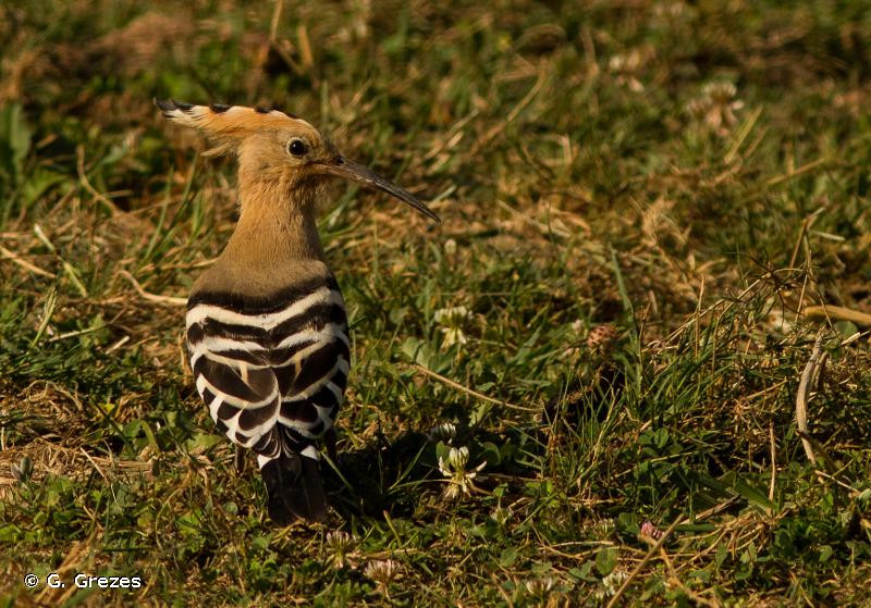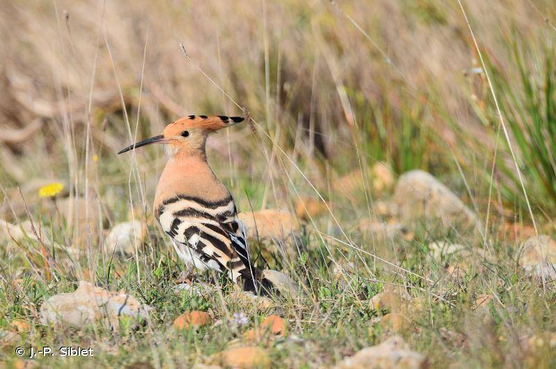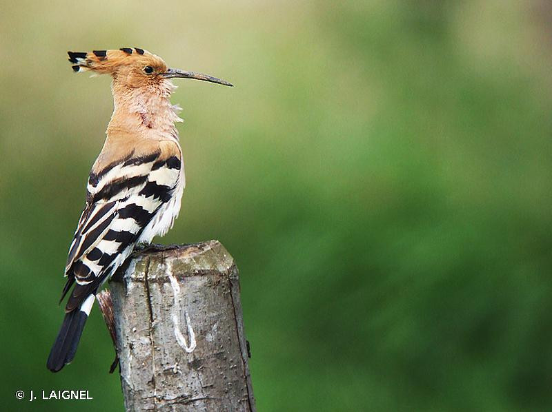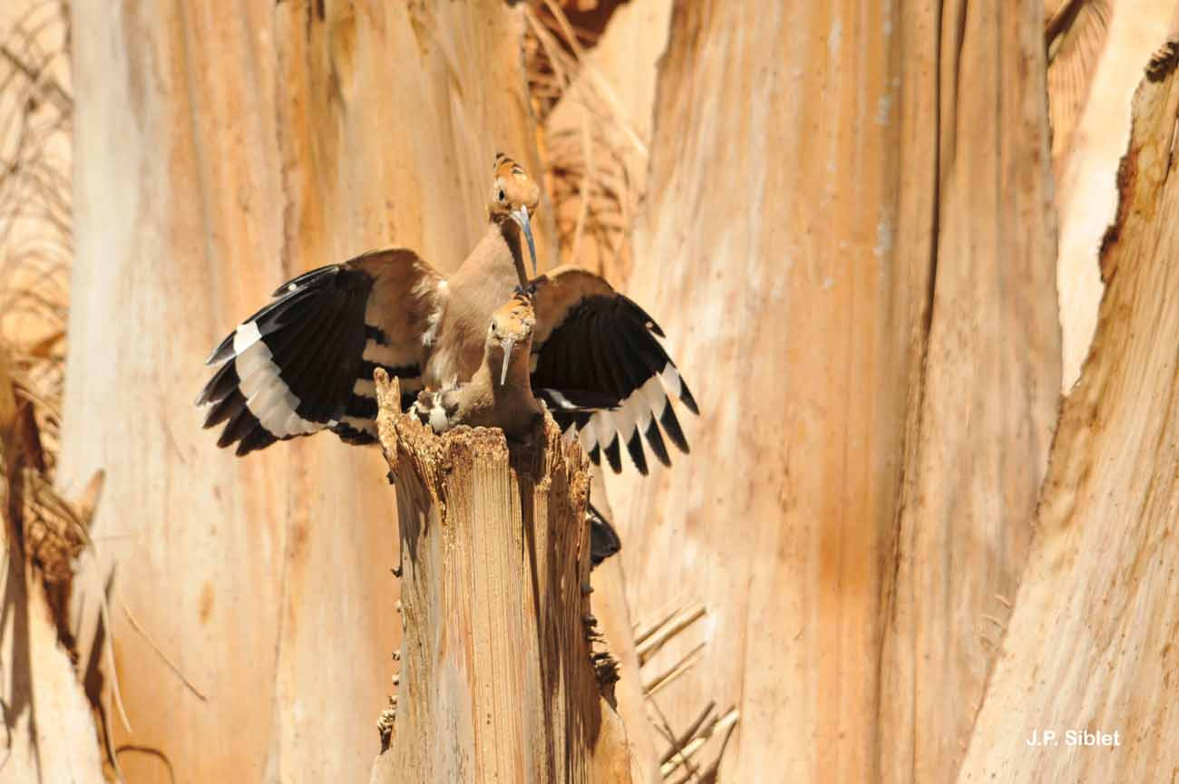 La Huppe fasciée est un oiseau de la taille du Geai des chênes Garrulus glandarius. Son plumage est caractéristique : tête, poitrine et partie antérieure du manteau sable orangé ; ailes, dos et queue noirs rayés de bandes blanches ; ventre et couvertures sous-caudales blanc pur ; flancs et bas de la poitrine marqués de quelques stries sombres. Les deux caractères les plus notables sont la présence d’une huppe érectile aux plumes maculées de noir à l’apex et d’un long bec gris sombre légèrement arqué, qui donne à la tête de la huppe une forme de pioche (epops en grec). En vol, la huppe présente une silhouette typique de grand papillon aux ailes larges et arrondies. Le chant, composé de deux à quatre notes, est à l’origine du nom latin Upupa.