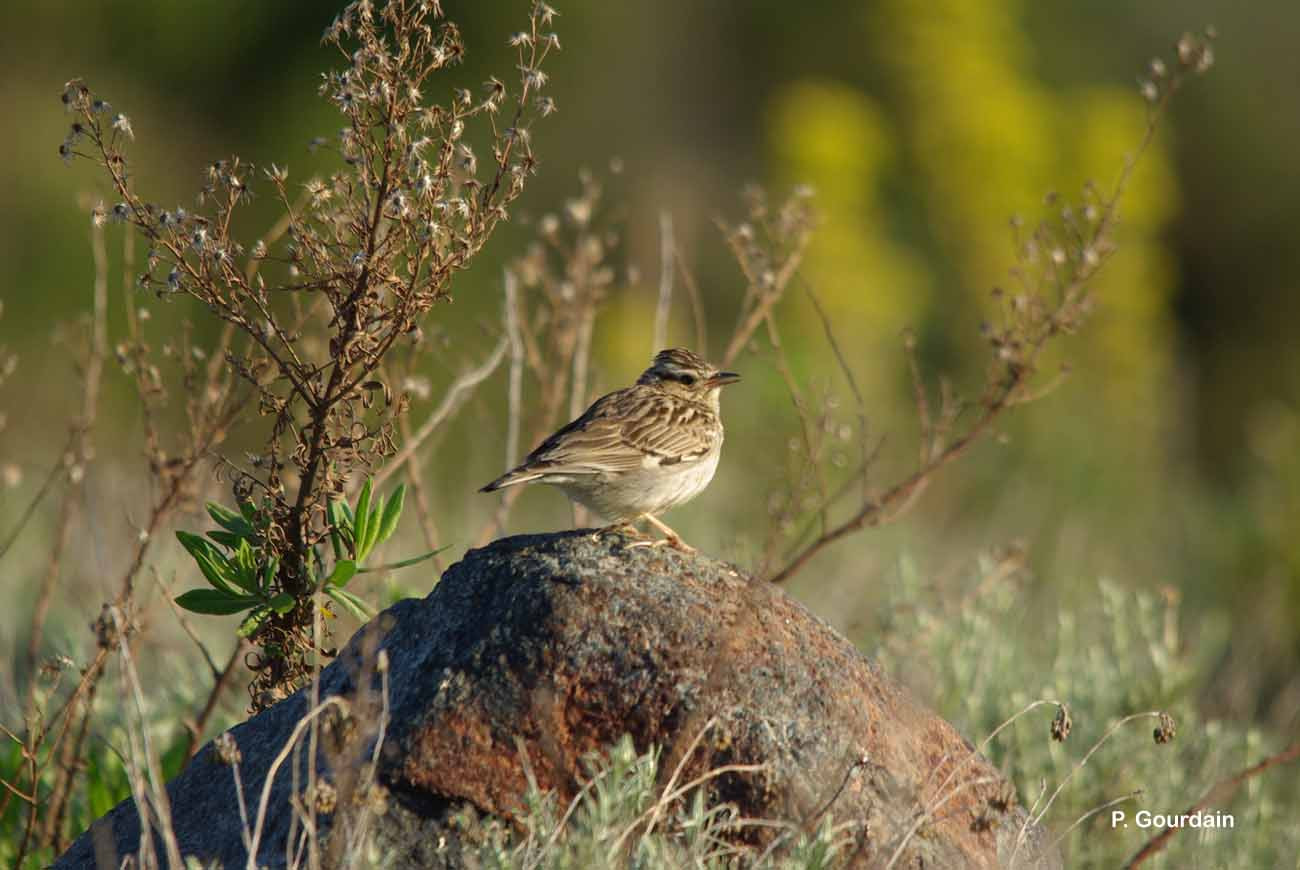 Les sourcils clairs de cette alouette se rejoignent à la nuque, ce qui la distingue de l'Alouette des champs (Alauda arvensis) qui est par ailleurs nettement plus grande.