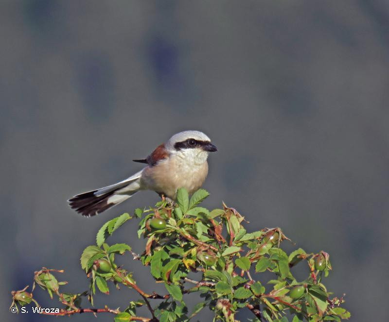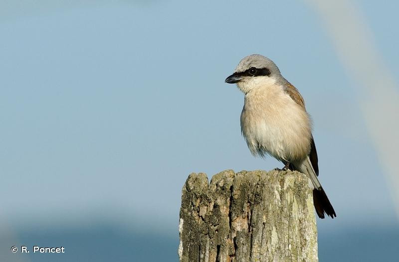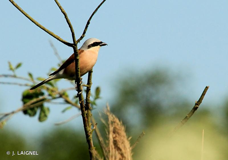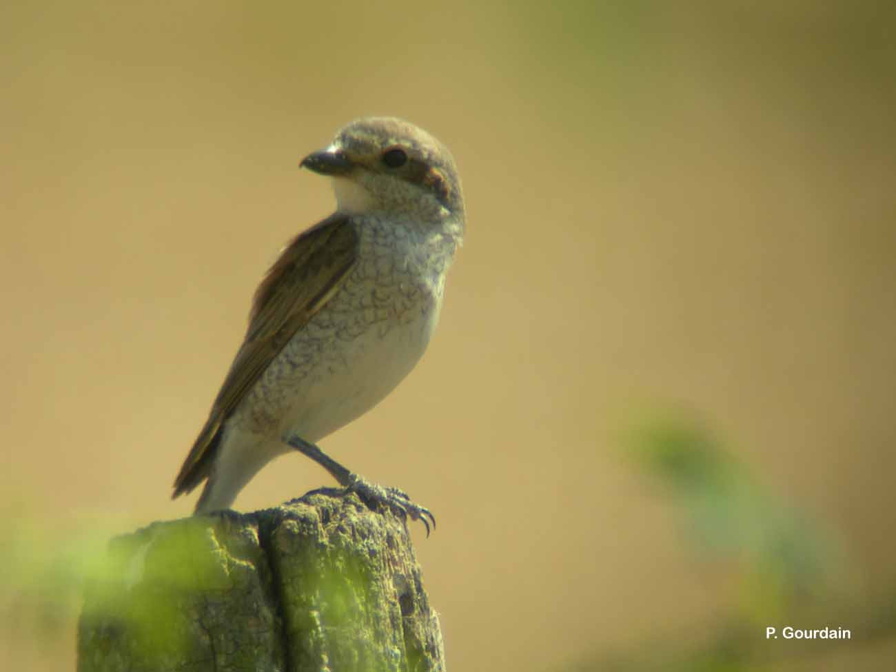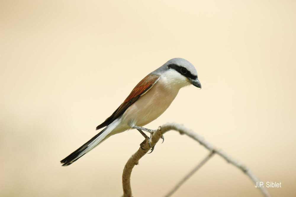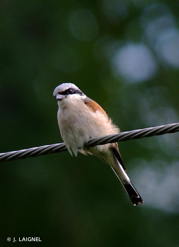 Le mâle adulte, vivement coloré, arbore un manteau brun roux, une calotte et un croupion gris cendré, une queue noire bordée de blanc à la base et des parties inférieures d’une couleur rose vineux. Le bec et les pattes sont noirs, de même que le masque, typique de la famille des laniidés. La femelle adulte est beaucoup plus terne, avec un dessus brun-gris, parfois roussâtre. Son masque facial est moins net que chez le mâle et son dessous d’un blanc jaunâtre sale est fortement vermiculé, barré de lignes noires.