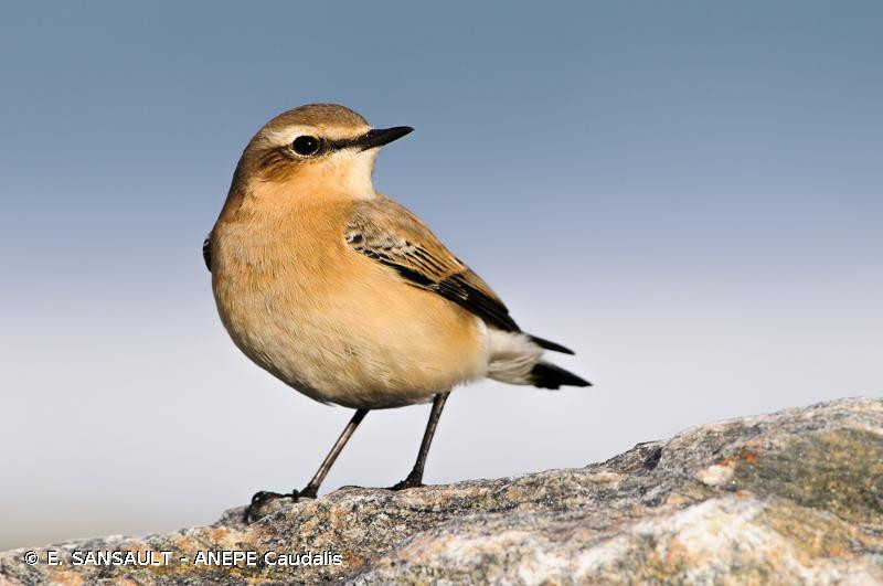 Le mâle a le dessus du corps gris bleuté. Les ailes ainsi que les joues et le bandeau sous l'oeil sont noirs. Un sourcil blanchâtre se prolonge jusqu'au bec. La gorge beige orangée s'étend plus ou moins sur la poitrine blanche. Chez la femelle, le dessus du corps est brun, les rémiges d'un brun plus foncé. Le dessous du corps est fauve avec le ventre crème et les joues chamois clair. Trait commun à tous les plumages, le blanc éclatant du croupion et des bords de la queue où se détache en noir un T renversé.