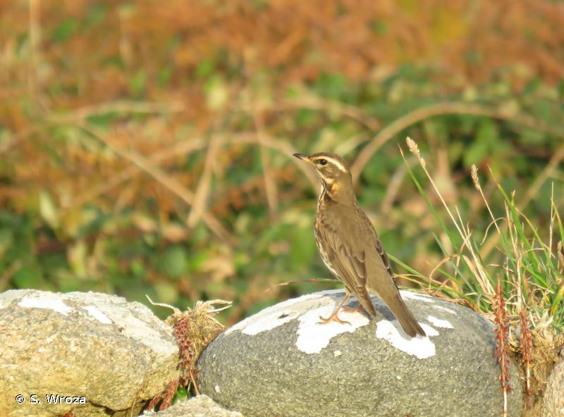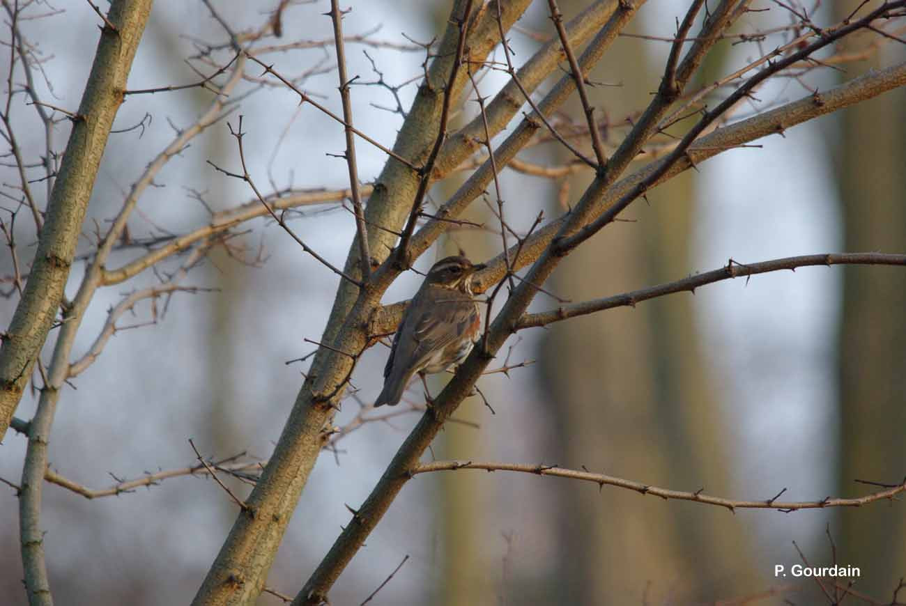 Oiseau de taille moyenne, un peu plus petit qu’un Merle noir. La tête présente un très net sourcil blanc crème. Ce caractère la distingue de toutes les autres espèces de grives présentes régulièrement en France. Les couvertures sous alaires et les flancs sont d’un roux tirant sur le rouge. La poitrine crème blanchâtre est marquée de stries noires plus ou moins diffuses.