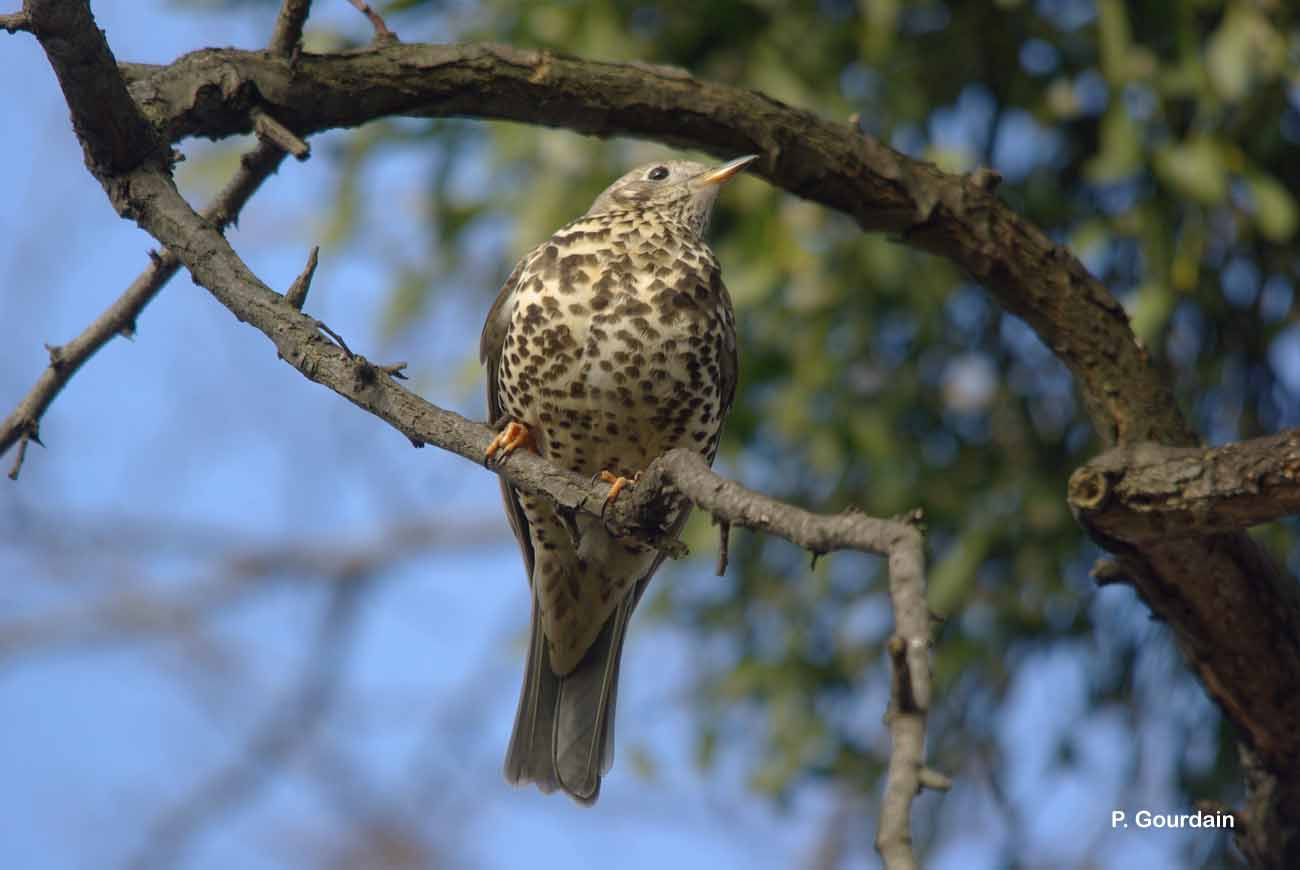 C’est la plus grosse grive d’Europe. Le dessus est gris brun pâle, la poitrine, le ventre et les flancs sont blanchâtres, très fortement marqués de taches noires. A l’envol, les coins de la queue sont blancs. Le chant, lent et mélodieux, est une série de courtes phrases répétées. Le cri le plus fréquent, caractéristique de l’espèce, est un son de crécelle appuyé et qui s’entend de loin.