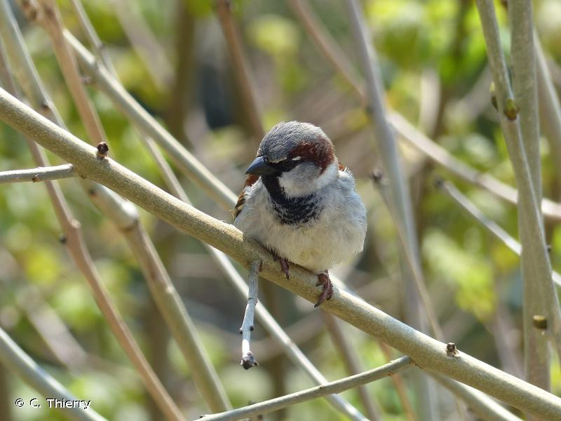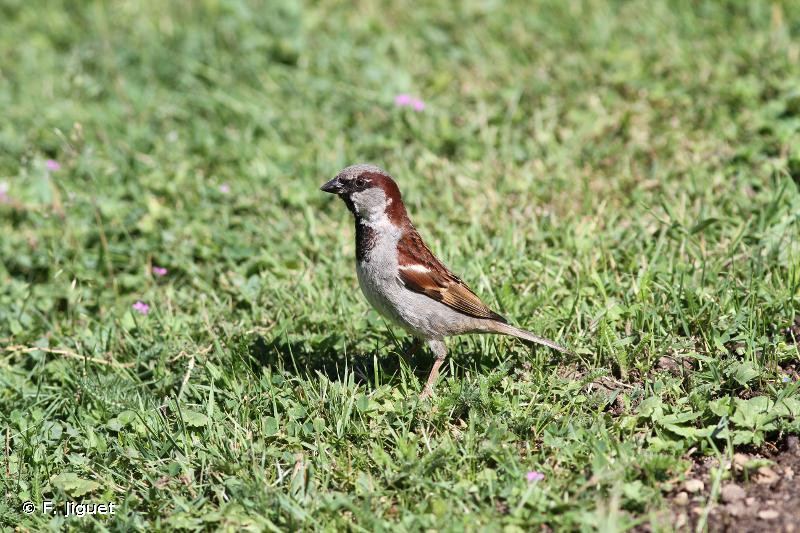 Bec conique de granivore. Le mâle présente une bavette noire. Sa calotte grise est prolongée d’une tache rousse à la nuque (contrairement au Moineau friquet, il ne présente pas de tache noire à la joue, ni de calotte rousse). Le plumage des femelles et des jeunes est grisâtre.