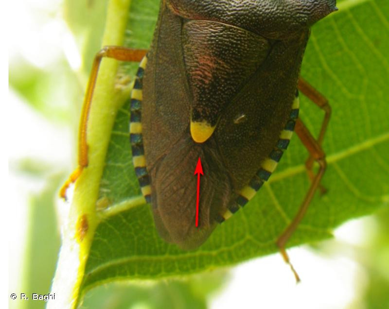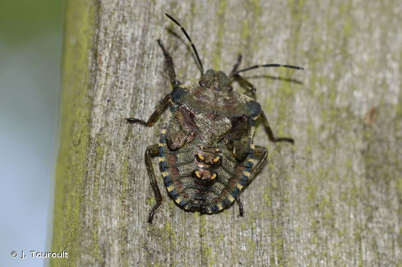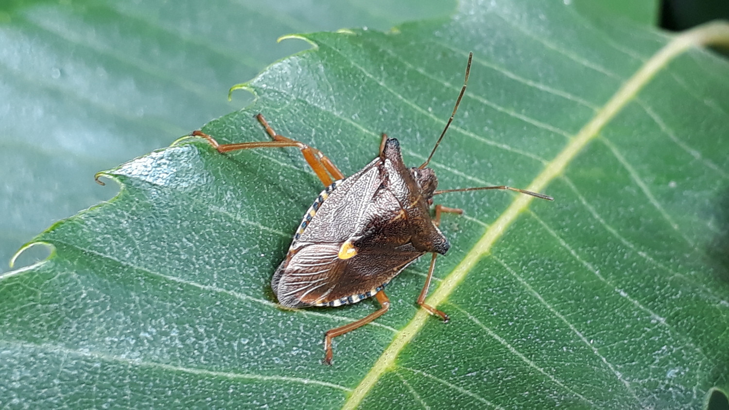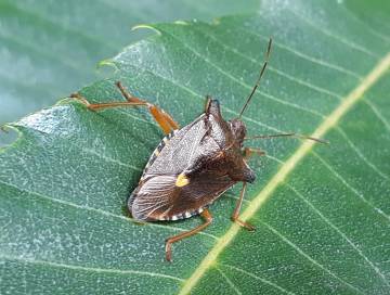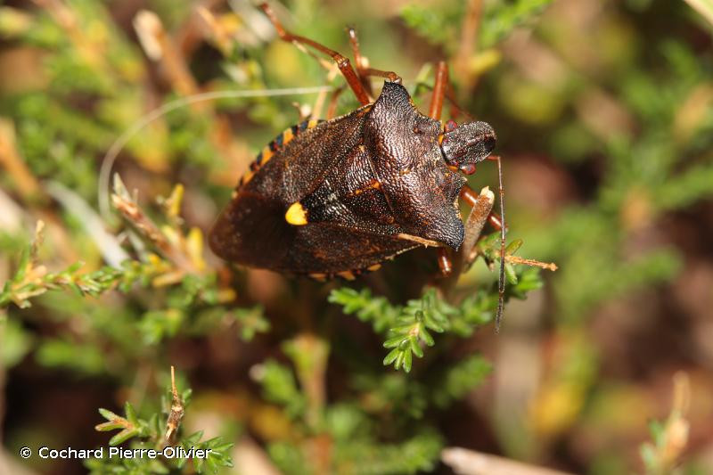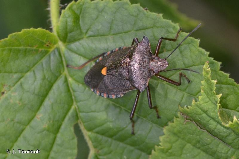Taille : 12 – 16 mm Diagnose : Grande punaise de couleur marron avec les pattes orange. Elle a les angles huméraux du pronotum prolongés en pointe élargie qui dépasse les bords du corps, le connexivum (bord de l’abdomen) bicolore alternativement sombre et clair, et l’apex du scutellum avec une tache orange. Détermination : Simple. Espèces proches : Peu de risque de confusion avec ses angles huméraux du pronotum caractéristiques, son connexivum bicolore et l’apex de son scutellum orange. Elle est vaguement similaire à Pinthaeus sanguinipes, une très rare espèce qui a la même coloration, mais celle-ci possède un rostre épais typique des Asopinae, des profémurs dentés, et 2 callosités blanches dans les angles du scutellum. Période d’observation : Avril à octobre avec un pic principal en aout. Biologie-éthologie : Espèce arboricole qui se nourrit des fruits, fleurs et bourgeons de plusieurs arbres, dont les arbousiers, aubépines, aulnes, bouleaux, charmes, chênes, cornouillers, érables, frênes, hêtres, mélèzes, noisetier, prunus, saules, tilleuls. Elle commet parfois des dégâts sur les poiriers, pommiers, cerisiers et pêchers cultivés. Les larves de stade II hibernent et les adultes apparaissent seulement en été. Biogéographie et écologie : Espèce répandue dans toute la région paléarctique, atteignant 61° de latitude nord dans la péninsule Scandinave, et vers l'est, l'Inde, la Corée et le Japon, alors qu'au sud elle évite les zones méditerranéennes. Elle atteint 1 850 m d’altitude. C’est une espèce assez commune, sauf en zone méditerranéenne sèche où elle est absente. Elle colonise les régions boisées humides et fraîches : forêts de feuillus et de conifères, bords des rivières boisés, landes, marais, tourbières.