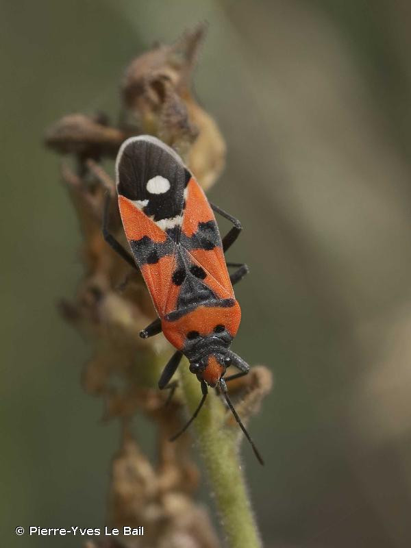 Grande punaise rouge et noire allongée. Tête rouge et noire avec les tubercules antennifères droits et peu saillants. Partie antérieure du pronotum noire et la partie postérieure rouge avec 4 taches noires allongées. Scutellum noir et cories rouges avec une large bande noire transversale centrale. Membranes noires avec un fin liseré blanc sur leur bord apical, une tache blanche centrale circulaire et une autre le long des cories.