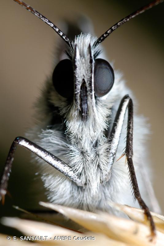 Le dessus des ailes est blanc ou crème avec des plages noires. Au niveau de l'aile antérieure, la cellule discoïdale est blanche sans dessin noir. Le dessous des ailes est identique mais les plages noires sont nettement plus claires. On observe une série d'ocelles au niveau de la bande submarginale.