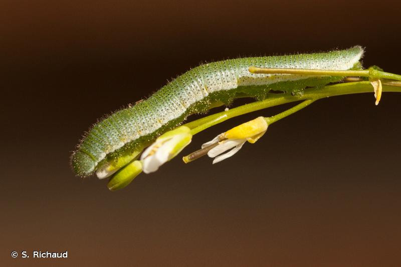 Papillon blanc dont l’apex de l’aile antérieure est noir et arrondi. Chez le mâle, la moitié externe est orange ce qui lui donne une allure caractéristique. Présence d’une petite tâche noire discoïdale sur le dessus de l’aile antérieure chez les deux sexes. Le revers est blanc persillé de vert. La chenille est vert bleuâtre avec une bande blanche bien délimitée sur la partie inférieure et diffuse sur la partie supérieure.