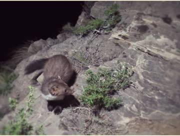 Martes martes (Linnaeus, 1758). La Martre porte une bavette jaune-orangée qui se prolonge entre les pattes antérieurs (et non sur le haut des pattes antérieures). Sa truffe est noir et son pelage plus dense. Des poils recouvrent ses pelotes plantaires.