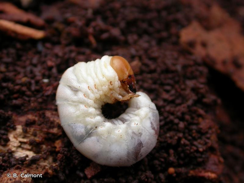 Corps entièrement noir mat. La femelle se reconnait à sa tête moins large, ses mandibules moins développées et à la présence de deux petits tubercules très rapprochés, au centre du front. La larve est de type « ver blanc », le corps blanc, mou et allongé, la tête et les pattes sclérifiées (dures), jaune-orangé.