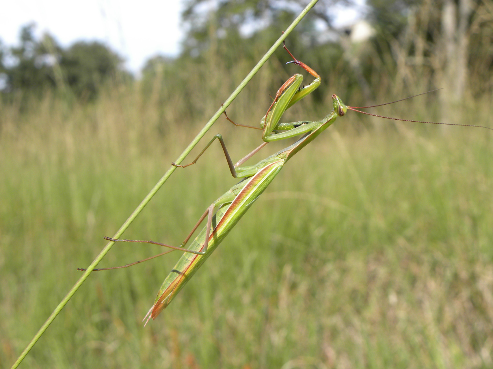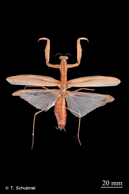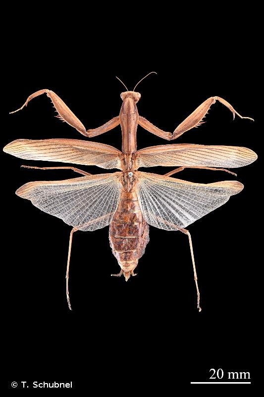 Insecte de grande taille, de coloration très variable selon les individus, de beige clair à brun foncé, en passant par le vert. Les pattes ravisseuses antérieures sont très bien visibles. Les ailes sont développées pour le vol uniquement chez les mâles. Les femelles ont les ailes un peu plus courtes, elles atteignent à peine l’extrémité de l’abdomen. Le pronotum n’a pas de caractéristiques particulières. Les hanches des pattes antérieures possèdent une macule noire contenant ou non une tache ronde blanche. L’abdomen de la femelle est fusiforme, assez renflé, surtout peu de temps avant de pondre l’oothèque contenant les œufs.
