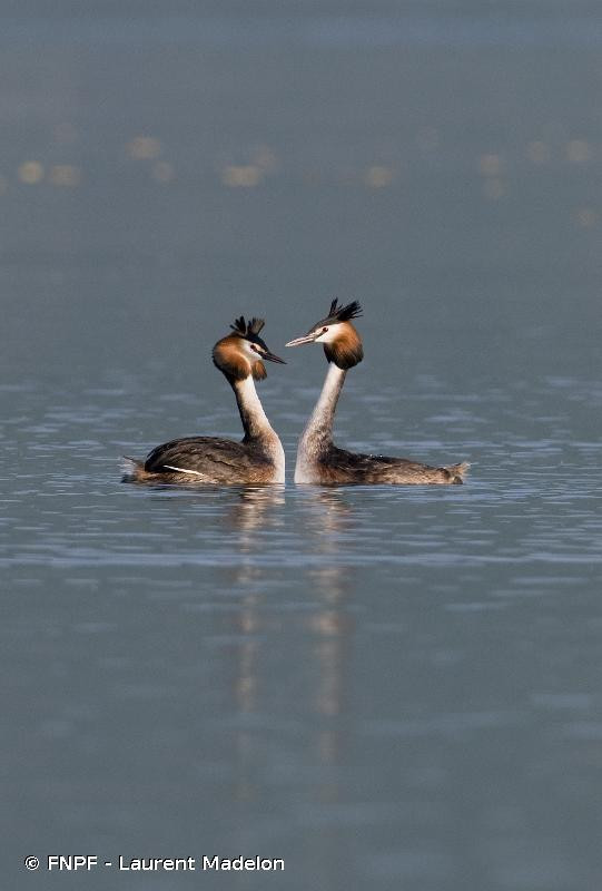 Le Grèbe huppé est faiblement grégaire. En dehors de la saison de reproduction, il est souvent solitaire, notamment en pêche, mais peut former des groupes de plus de 100 individus. Il arrive par ailleurs qu’il tienne un petit territoire alimentaire au cours de l’hiver, alors que certains couples restent sur leur territoire de nidification tout au long de l’année. La formation du couple débute au cœur de l’hiver, avant le choix du site et l’occupation du territoire. Cette période d’appariement peut être longue et le couple instable, en partie du fait des compétitions pour les sites de nid. La plupart des couples se séparent lorsque les jeunes s’émancipent et que la femelle part effectuer sa mue postnuptiale partielle. Toutefois, certains se réapparient en fin d’été et restent associés jusqu’en début d’hiver, voire jusqu’à la saison de reproduction suivante. Les spectaculaires rituels aquatiques ont surtout lieu lors de la formation du couple et de la délimitation du territoire.